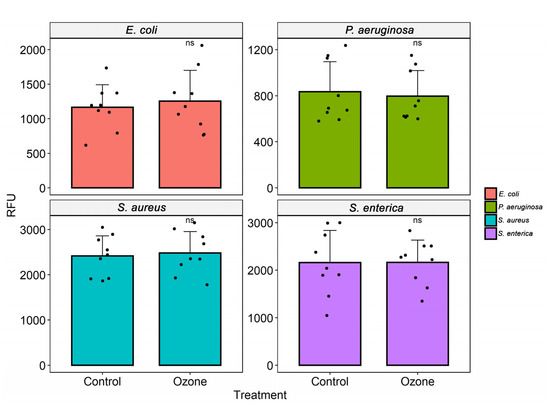 Analysis of cell viability after ozone treatment in different bacterial strains (S. aureus (ATCC 6538), S. enterica (ATCC 10708), E. coli (ATCC 25922), and P. aeruginosa (ATCC 15442)). The measurement of fluorescence intensity (relative fluorescence units, RFU) after the conversion of resazurin to resofurin by viable bacteria was performed in the control group (no treatment) and bacterial suspensions (105 CFU/mL) after exposure to ozone for 40 min. Results represent values from 3 randomly chosen colonies in the control group (no treatment) and after treatment with ozone. The black dots represent the values of fluorescence emission after addition of resazurin.