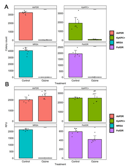(A) The number of colony-forming units (CFU) in different bacterial strains (S. aureus (MRSA), P. aeruginosa (XDR), A. baumannii (PDR), and K. pneumoniae (KPC+)) were counted. The number of CFU in the control group (no treatment) and bacterial suspensions (105 CFU/mL) after exposure to ozone for 40 min was quantified. The black dots represent the number of CFU count of the different strains. (B) Analysis of cell viability after ozone treatment in different bacterial strains (S. aureus (MRSA), P. aeruginosa (XDR), A. baumannii (PDR), and K. pneumoniae (KPC+)). The measurement of fluorescence intensity (Relative fluorescence units, RFU) after the conversion of resazurin to resofurin by viable bacteria was performed in the control group (no treatment) and bacterial suspensions (105 CFU/mL) after exposure to ozone for 40 min. Results represent three randomly chosen colonies in the control group (no treatment) and after ozone treatment. The black dots show cell viability values through fluorescence emission after the addition of resazurin. ** Statistically significant (p < 0.01); **** statistically significant (p < 0.001).