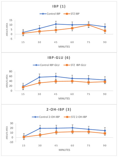 HPLC-UV analysis of the ether extract of bile samples showed the presence of IBP (1), IBP-GLU (6), and 2-OH-IBP (3). HPLC-MS analysis confirmed the presence of 1 (m/z 205.1229), 6 (m/z 381.1549), and 3 (m/z 221.1178) in both the control and the hyperglycemic samples. To keep the number of experimental animals low, the results were evaluated by comparing the integrated HPLC-UV peak areas (relative to the internal standard) of the compounds. The areas were lower in the bile samples of the STZ-treated animals at each investigated timepoint (Figure 3).