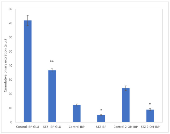 Cumulative biliary excretion (HPLC-UV (Method II) based integration) of IBP (1), IBP-GLU (6), and 2-OH-IBP (3) after the 90-min luminal perfusion of 250 μM IBP in control and hyperglycemic (STZ-treated) rats. Each value represents the average of five independent experiments ± standard error. Significant difference from the control value: * p < 0.05, ** p < 0.01.