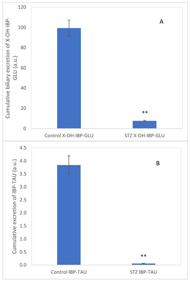 Cumulative biliary excretion (HPLC-MS based integration) of the (A) X-OH-IBP-GLU (9) and (B) IBP-TAU (7) after the 90-min luminal perfusion of 250 μM IBP in control and hyperglycemic (STZ) rats. Each value represents the average of five independent experiments ± standard error. Significant difference from the control value: ** p < 0.01.