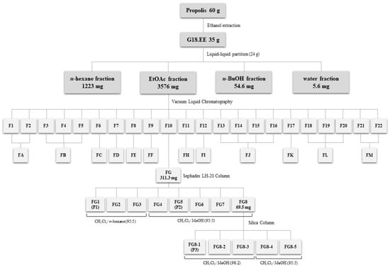 Propolis G18 was extracted, as previously described [9], and a dried ethanol extract (EE) of propolis was obtained (70% yield) after solvent evaporation. G18.EE was stored at 4 °C, in the dark, until further use. G18.EE (4 g) was dissolved in ethanol (20 mL) and deionized water (200 mL) and successively partitioned with n-hexane, EtOAc and n-BuOH (3 × 400 mL each). Organic layers were pooled, dried over sodium anhydrous sulphate, and concentrated under reduced pressure at 40 °C to obtain the G18.EE-n-hexane (1.22 g), G18.EE-EtOAc (3.58 g), G18.EE-n-BuOH (54.6 mg) and G18.EE-water (5.6 mg) fractions. The partition process was repeated 6 times, with 4 g of G18.EE each time, in order to obtain satisfactory amounts of fractions for further isolation work. All fractions were stored at 4 °C in the dark until further use and after evaporation of the respective solvent.