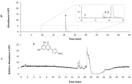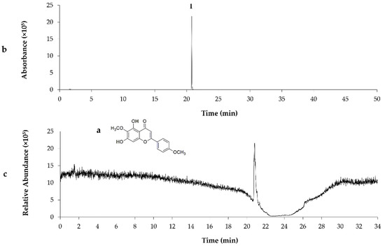 The chemical structure of pectolinarigenin (a); LC-MC chromatogram of P1 isolated from G18.EE-EtOAc fraction using ESI (b); TIC chromatogram in negative ion mode (c); Pectolinarigenin (1).