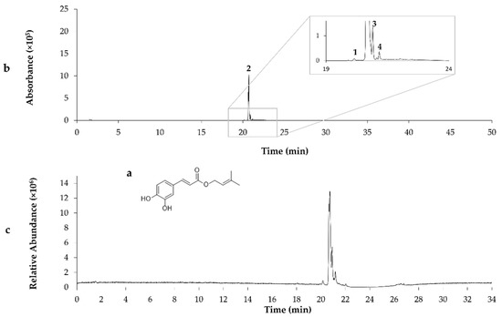 The chemical structure of caffeic acid isoprenyl ester (a); LC-MC chromatogram of P3 isolated from G18.EE-EtOAc fraction using ESI (b); TIC chromatogram in negative ion mode (c); Quercetin-dimethyl ether (1); Caffeic acid isoprenyl ester (2); Caffeic acid phenylethyl ester (3); Caffeic acid cinnamyl ester (4).