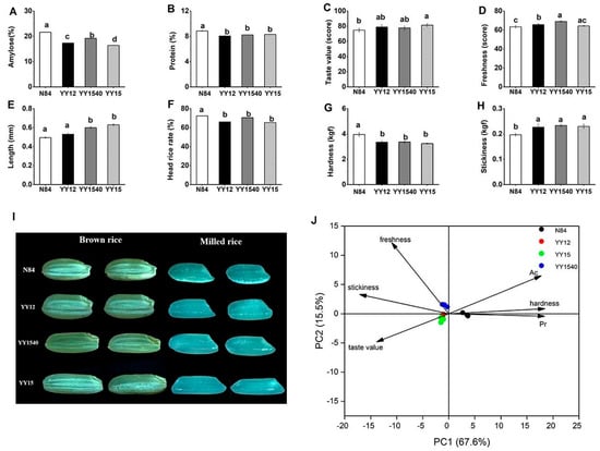 Rice comprehensive quality of YY-IJHR. The amylose content (A), protein content (B), taste value (C), freshness (D), length (E), head rice rate (F), hardness (G), and stickiness (H), and stereomicrograph (I), as well as principal component analysis (PCA) of grain quality (J) of N84 and YY-IJHR cultivars. Different lowercase letters indicate significant differences at p < 0.05 (Ducan’s test).
