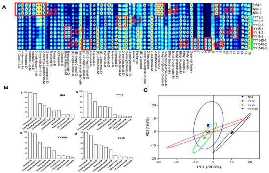 The volatile flavor components of YY15 were mainly aldehydes and esters, while those of YY12 were mainly aldehydes and ketones (Figure 2A). As shown in Figure 2A, these aroma compounds’ concentrations were relatively low. Notably, the aroma compound concentration of YY1540 was relatively high. Therefore, the cultivars of YY12 and YY15 were negative with PC2, while YY1540 was positive (Figure 2C). These results suggested that there was a significant difference among three YY-IJHR cultivars and N84, which was revealed by the PCA plot.