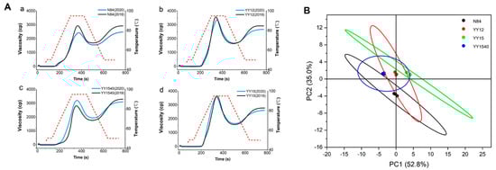 The pasting properties of YY-IJHR. (A) Comparison of RVA curves in new rice and rice stored for one year from N84 (a) and YY12 (b), YY1540 (c), YY15 (d) as well as PCA of pasting properties (B) of N84 and YY-IJHR cultivars.