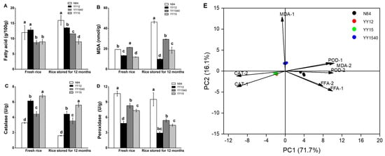 The storability of YY-IJHR. The FFA content (A), MDA content (B), catalase activity (C) and peroxidase activity (D) characteristics of YY-IJHR cultivars and N84.In the biplot of PCA of storability (E). FFA-1 represented the free fatty acid content of fresh rice, FFA-2 represented the free fatty acid content of rice stored for 12 months; MDA-1 represented the MDA content of fresh rice, MDA-2 represented the MDA content of rice stored for 12 months; CAT-1 represented the CAT activity of fresh rice, CAT-2 represented the CAT activity of rice stored for 12 months; POD-1 represented the POD activity of fresh rice, POD-2 represented the POD activity of rice stored for 12 months. Different lowercase letters indicate significant differences at p < 0.05 (Ducan’s test).