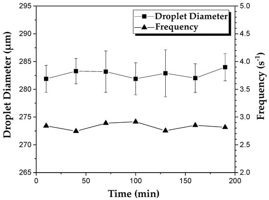 Figure 2 shows the changes in size and generation frequency of PEGDA-99 droplets during continuous operation of the device at the continuous phase flow rate of 0.6 mL/h, the dispersed phase flow rate of 0.12 mL/h, and the orifice size of 400 µm. Clearly, the applied emulsion formulation and process conditions led to a stable droplet generation over 200 min, with an average droplet diameter of 282 µm and the coefficient of variation (CV) of droplet sizes of 1.6%. The average droplet generation frequency was 2.8 Hz, as calculated from the mass balance equation for the dispersed phase: , where is the dispersed phase flow rate and is the average droplet diameter.