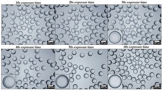 Optical microscopy images of PEGDA particles produced using different UV light exposure times and captured using 4× objective lens. The insets show magnified images of individual particles captured using 10× objective lens. The UV light intensity was 75 mW/cm2.