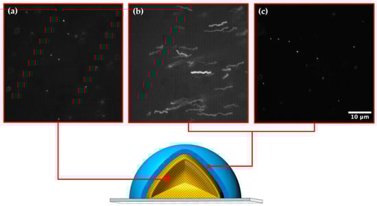 Schematic diagram of a partially photo-crosslinked PEGDA particle and epi-fluorescence micrographs of a “maximum intensity Z-projection” (processed on ImageJ) showing the trajectories of fluorescent polystyrene nanoparticles in different regions of the particle: (a) Polymerised core region after 30 s; (b) Unpolymerised shell region after 30 s; (c) Fully polymerized shell region after 60 s of UV light exposure at 75 mW/cm2.
