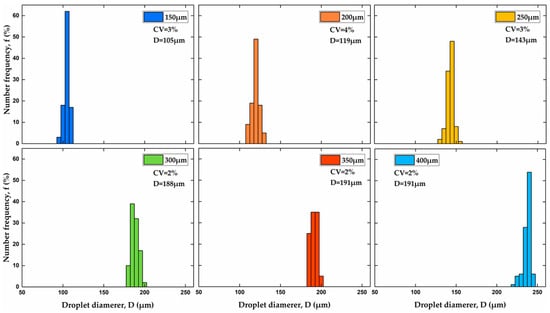 Figure 6 shows size distribution histograms of particles produced using various orifice sizes at the same flow rate ratio of 6. The coefficient of variation was used as an indicator of particle size uniformity: , where is the standard deviation of particle sizes and is the number-average particle diameter. The particles with a CV of 2–3% were obtained in all cases, except for the orifice size of 200 μm. According to the National Institute of Standards and Technology (NIST), particles are monodispersed if at least 90% of the particles have a size within 5% of the average size, . If the particle sizes are normally distributed, which can be assumed here, 90% of the particles will have a size within 1.64 standard deviations away from the mean. It means that, for monodispersed particles, 1.64 ≤ 0.05, or ≤ 3%.