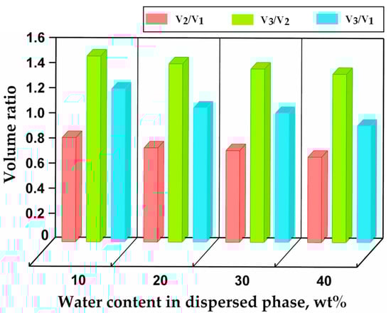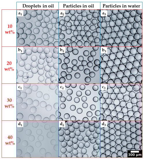 Volume changes during droplet curing and particle transfer into deionised water are shown in Figure 9. After curing, the particle volume represented 80%, 75%, 70%, and 68% of the initial droplet volume for the dispersed phase with 10 wt%, 20 wt%, 30 wt%, and 40 wt% water, respectively, as compared to 97–99% for the dispersed phase without any water. Shrinkage is inversely proportional to the molecular weight of the monomer units [53], which was not changed here, but it is also inversely proportional to the number of crosslinkable groups per unit volume, which is smaller at a higher water content in the dispersed phase. Therefore, in more dilute solutions, the average distance between prepolymer molecules is greater, and higher-volume contraction occurs during curing. After the particles were transferred from silicone oil to water, they swelled and reached the equilibrium volume in several hours. The water intake by hydrogel particles can be explained by the hydrophilic nature of their crosslinked polymer chains and their mesh-like structure. In the steady state, was 1.2, 1.1, 1.0, and 0.93 for the dispersed phase with 10 wt%, 20 wt%, 30 wt%, and 40 wt% water, respectively. The volume of swollen particles was 7% smaller than the initial droplet volume when the water content in the dispersed phase was 40 wt%, since a significant amount of water was expelled from the droplets during curing. When the water content in the dispersed phase was 10 wt% and 20 wt%, the swollen particles were larger than the initial droplets.