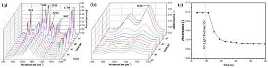 For real-time analysis of the polymerisation kinetics of pure PEGDA 700, an in situ ATR-FTIR setup was used to record FTIR spectra at 3.8-s time intervals, as shown in Figure 10a,b. The mixture composed of 99 wt% of PEGDA 700 and 1 wt% of Darocur 2959 was placed in a closed chamber and exposed simultaneously to UV-A light and infrared radiation. The spectra in the 600–1800 cm−1 and 1600–1650 cm−1 wavenumber ranges exhibit the characteristic bands at 1064, 1186, 1636, and 1719 cm−1, corresponding to stretching aliphatic ether (C-O), ester (O=C-O), alkene double carbon (C=C), and α,β-unsaturated carbonyl (O=C-C=C) bonds of PEGDA.
