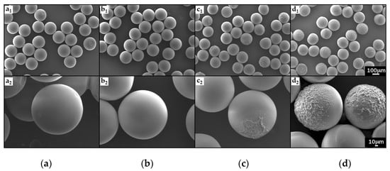 SEM images of PEGDA particles prepared with different amounts of water in the dispersed phase: (a) 0 wt%; (b) 30 wt%; (c) 40 wt%; (d) 50 wt%. 100 µm scale bar applies to figures (a1–d1), and 10 µm scale bar applies to figures (a2–d2).