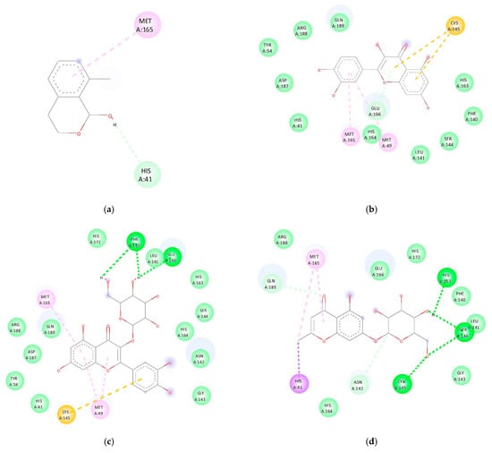 Recently, during the COVID-19 pandemic, a number of traditional medicinal ingredients were promoted as drugs to prevent or restore the COVID-19 disease, such as 1,8-Cineol essential oil, several other essential oils, and Andrographis paniculata extract [9,10,11]. Considering that M. oleifera leaves are widely consumed as vegetables that have a number of health benefits, an in-silico analysis was conducted to explore the possible interactions of the bioactive compounds contained in M. oleifera leaves and the main protease (Mpro) of the SARS-CoV-2 protein. Understanding these interactions can help us to gain knowledge on whether M. oleifera leaf infusion has the capacity for anti-SARS-CoV-2 treatment.