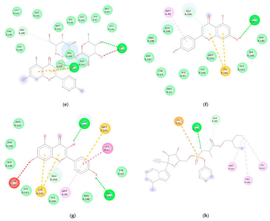 Results of Mpro docking with several active compounds in M. oleifera leaf infusion. (a) Mpro-gentiatibetine; (b) Mpro-quercetin; (c) Mpro-Quercetin-3-O-glucoside; (d) Mpro-Undulatoside A; (e) Mpro-Kaemferol-3-O-neopiroside; (f) Mpro-apigenin; (g) Mpro-Kaempferol; (h) Mpro-Remdesivir.