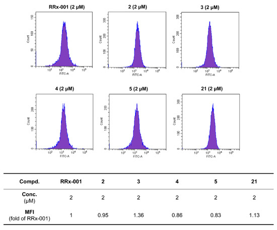 Intracellular NO generated by the tested compounds using fluorescent indicator DAF-FM DA in RBE cells. After treatment with RRx-001 and compounds 2–5 and 21 (2 μM) for 2.5 h, cells were collected, followed by flow cytometric analysis.