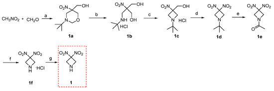 As shown in Scheme 1, the Mannich reaction of nitromethane, paraformaldehyde, and tert-Butylamine obtained intermediate 1a, which was hydrolyzed with 10% hydrochloric acid to generate 1b, further underwent the Mitsunobu reaction to get 1c in the present of diisopropyl azodicarboxylate (DIAD) and triphenylphosphine (Ph3P). Nitrification reaction of 1c with the NaNO2 and K3Fe(CN)6 of NaOH aqueous solution produced dinitroazetidine derivative 1d, which reacted with acetic anhydride using BF3·Et2O as a catalyst to form amide 1e. Finally, the key intermediate 1 was synthesized via the hydrolyzation of 1e forming intermediate 1f in the present of 10% hydrochloric acid and NaHCO3 aqueous solution, respectively.