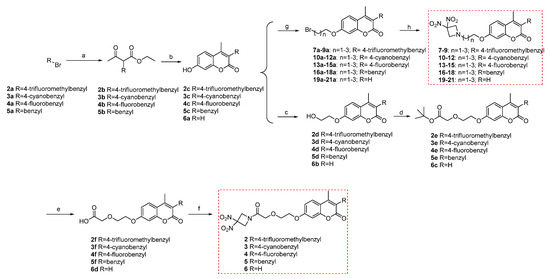 Synthetic routes of target compounds 2–21. Reagents and conditions: (a) ethyl acetoacetate, NaH, THF, 0–60 °C; (b) resorcinol, H2SO4 (70–75%), r.t.; (c) ClCH2CH2OH, NaI (cat.), K2CO3, DMF, reflux; (d) NaH, tert-butyl bromoacetate, anhydrous THF; (e) TFA, DCM, r.t.; (f) HATU, DIPEA, 3,3-dinitroazetidine, DMF; (g) haloalkane, K2CO3, NaI, DMF, or CH3CN; (h) 3,3-dinitroazetidine, K2CO3, NaI, DMF.