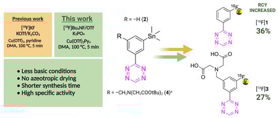 Direct labeling of sensitive compounds can sometimes be challenging because of the harsh reaction conditions required for 18F-fluorinations [18,19]. For example, highly reactive mono- or bis-(hetero)aryl-substituted Tzs tend to decompose under the nucleophilic conditions used for standard 18F-fluorination approaches (SN2 or SNAr) [15,17,20]. As a result, many efforts have been made to improve radiolabeling conditions so that these methods can be applied to compounds that could not previously be 18F-fluorinated [18,21,22]. Mossine et al. recently reported a 18F-labeling method using relatively mild labeling conditions for copper-mediated fluorination of tin precursors [18]. This method allowed for the use of non-nucleophilic bases for the elution of fluoride-18 from anion exchange cartridges (fluoride-18 is standardly trapped on these cartridges during its work-up), and reduced the basicity of the reaction [18]. Our group has advanced this methodology for the 18F-labeling of highly reactive Tzs [17,21,23,24,25]. In particular, we reported the first direct aromatic fluorination of Tzs from stannane precursors [23]. We were also able to automate the reaction—a main requirement for the implementation of radiolabeling procedures for cGMP production of clinically relevant PET probes [19]. Additionally, aromatic 18F-tracers are typically more stable towards defluorination than their aliphatic counterparts [26,27,28].