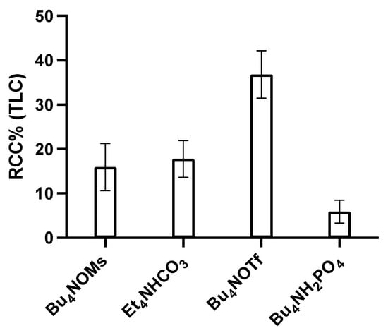 Different eluent systems were tested, at a concentration of 20 mM (in MeOH, 1 mL), to explore their influence on the elution efficiency (EE) and RCC of the reaction. We tested Bu4NOMs, Et4NHCO3, Bu4NOTf, Bu4NH2PO4, and TEAHF. Besides the latter elution system, the elution efficiency (EE) exceeded 90% for all other conditions when the QMA was preconditioned with 0.5 M K2PO4 (aq.). In contrast, the observed RCC differed depending upon which elution system was used. Radiolabeling using Bu4NH2PO4 as eluent resulted in RCCs of 6%. This could be due to the acidity of the eluting anion. As expected, elution with the non-basic anions, OTf− and OMs−, as well as using Et4NHCO3 in combination with multicharged phosphate (PO43−) for precondition the QMA resulted in higher RCCs (Figure 2). The highest RCC was achieved using Bu4NOTf and can be explained by the lower pKa value of OTf− compared to the other anions used. This translates to a lower ability of OTf− to displace preconditioning anions during the elution. Consequently, less basic conditioning anions are eluted and the basicity for subsequent reactions in the reaction vial is lowered.