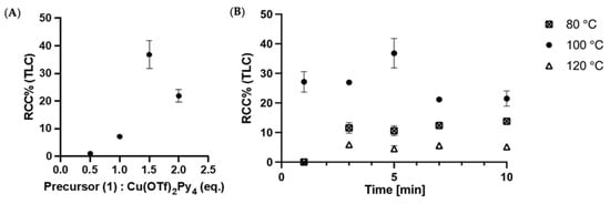 (A) Effect on RCC when adding different equivalents of Cu(OTf)2Py4 (0.5, 1, 1.5, 2) with respect to a fixated precursor amount (2). (B) Influence on RCC when changing time and temperature. Reaction conditions: PO43− QMA precondition, eluted with Bu4NOTf (20 µmol) in MeOH. Precursor 2 (3.2 mg, 10 µmol) and (A) different equivalent of Cu(OTf)2Py4 in DMA, for 5 min at 100 °C; (B) Cu(OTf)2Py4 (1.5 equiv., 10 mg, 15 µmol) for different time points (3, 5, 7, 10 min) and temperature (80 °C, 100 °C and 120 °C). The crude reaction was followed by radio-TLC and radio-HPLC (SI, Table S3). n = 3, error bars = standard deviation.