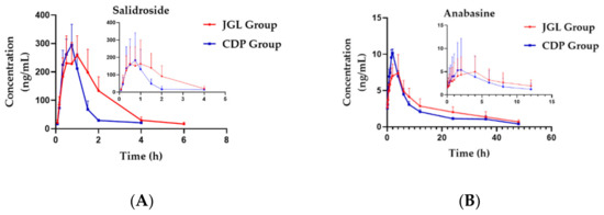 Chicago/Turabian StyleZheng, Lin, Ting Zhou, Hui Liu, Zuying Zhou, Mingyan Chi, Yueting Li, Zipeng Gong, and Yong Huang. 2022. "Pharmacokinetics Study of Jin-Gu-Lian Prescription and Its Core Drug Pair (Sargentodoxa cuneata (Oliv.) Rehd. et W and Alangium chinense (Lour.) Harms) by UPLC-MS/MS" Molecules 27, no. 13: 4025. https://doi.org/10.3390/molecules27134025