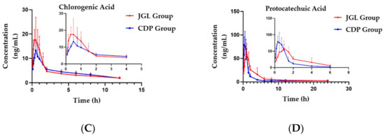 | Tmax (h) | JGL | 0.72 ± 0.31 | 2.83 ± 1.33 | 0.49 ± 0.15 | 0.92 ± 0.38 * |