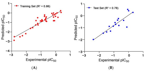 Observed and predicted TLR7 antagonistic activities of (A) training set and (B) test set compounds for the developed 2D-QSAR model.