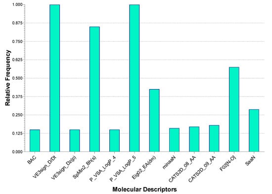 In addition, the frequency of the descriptors comprised in the selected model was evaluated among all the generated five-descriptor models. All the top-occurring descriptors were found to be comprised in our selected model (Figure 2). This showed that the selected descriptors were chosen according to their consistent importance.