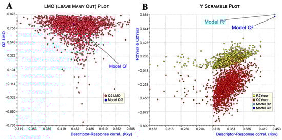 Apart from the fitting criteria explained above, which elucidated the quality of the correlation, additional cross-validation technique (internal validation) parameters such as variance in prediction using leave-one-out (Q2LOO: 0.83), leave-many-out (Q2LMO: 0.80), and Y-scramble (R2Yscr: 0.13; Q2Yscr: −0.28) methods were employed for better assessment of the precision and robustness of the model. The high average Q2LMO value of the random models generated from 2000 iterations with larger perturbations was quite close to the R2 and Q2LOO values, indicating the stability of the selected model [50] (Figure 3A). The doubt of chance correlation was eliminated, as demonstrated from the Y-scramble plot when the R2 and Q2 values of the selected model were far and much greater than the average R2Yscr and Q2Yscr values, respectively (Figure 3B) [51].