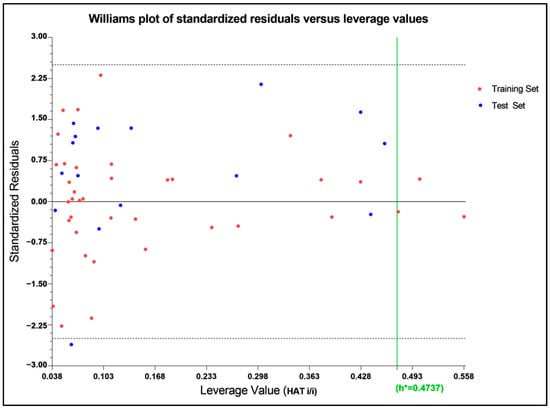 The applicability domain is a region within a Williams Plot (scatter plot of standard residual response and leverage values) bounded by 2.5 standard deviation units in the ordinate and a HAT leverage threshold value in the abscissa side [57]. The 2.5σ limit was chosen to narrow the domain even more than 3σ, which covered 99% of the distributed data [58]. The applicability domain as expressed in the William Plot (Figure 4) indicated a threshold leverage value (h*) of 0.474, which encompassed a majority of the molecules within the domain, with leverage values lower than that, except for only three compounds of the training set as outliers (compounds 26, 40, and 44). Even a stringent standardized residual threshold of 2.5σ managed to embrace all the molecules, except only a single outlier (compound 9), indicating that the model could be considered for the design of new TLR7 antagonists with improved activities.
