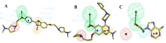 Ligand pharmacophore mapping of training set: (A) most active compound 32 (IC50: 0.43 µM), (B) most active compound 14 (IC50: 0.7 µM), and (C) inactive compound 44 (IC50: 684 µM). The pharmacophoric features HBA, HYA, PI, and RA are signified with green, blue, red, and orange, respectively.