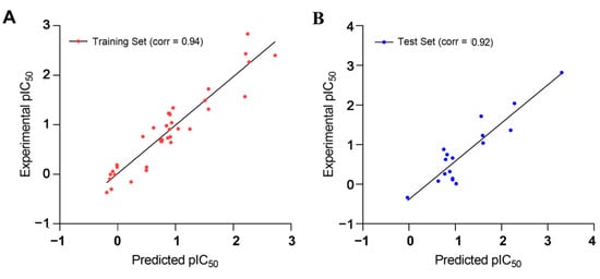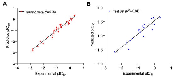Plots of experimental TLR7 inhibitory activities versus predicted activities of (A) training set and (B) test set molecules for the 3D-QSAR model.