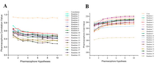 Difference in correlation (A) and cost values (B) of hypotheses between the selected pharmacophore models: Hypo1 and 19 random spreadsheets.