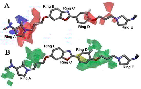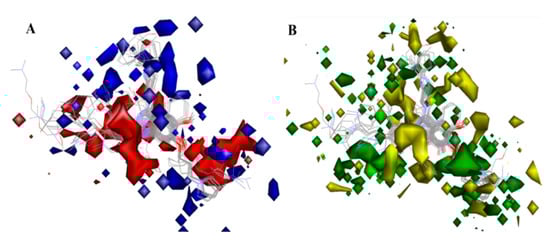(A) 3D-QSAR model coefficients on electrostatic potential grids. Blue represents positive coefficients; red represents negative coefficients. (B) 3D-QSAR model coefficients on Van der Waals grids. Green represents positive coefficients; yellow represents negative coefficients.