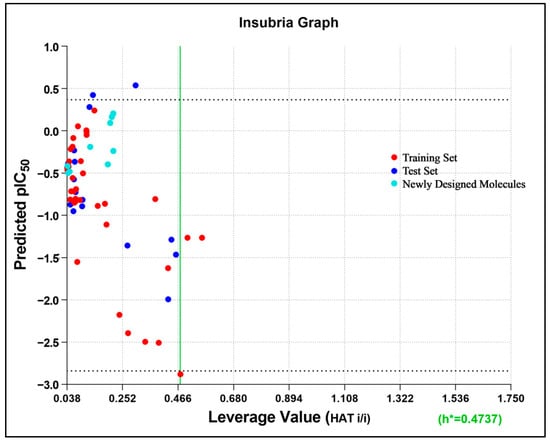 The cumulative ligand-based pharmacophore and 3D-QSAR study using all 54 reported molecules with diverse activities highlighted the importance of different electrostatic, steric, and hydrophobic feature distributions of the molecular dataset with significant correlation to their corresponding TLR7 inhibitory activities. Structural modification on the 3D-aligned quinazoline template molecule (compound 14) was initiated considering the 3D-QSAR field effects and retaining the pharmacophoric features. Moreover, for any substitution, structural insights indicated from the 2D-QSAR were also considered. The 2D descriptor values of the designed quinazoline molecules were also found to follow the 2D-QSAR model equation (Table S4). The designed molecules were also found to be located properly within the applicability domain of the 2D-QSAR model. This was evident from the Insubria plot (a variation of a Williams Plot to predict results for chemicals that have no experimental data available, replacing the standardized residual with the predicted value on the y-axis) [62,63], which established the validity of the designed molecules within the domain of the 2D-QSAR model (Figure 13).