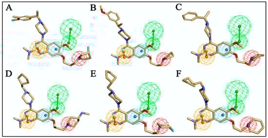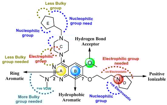 According to the molecular mappings, there were no sites for electrostatic potential grids or Van der Waals grids for ring A and ring B of quinazoline core template molecule 14 (Figure 11), implying that those locations were beyond the scope of any further modifications in this work. The 3D-QSAR isogrids revealed that electrostatic (red contour) and sterically (yellow) unfavorable groups enclosed the ortho and para positions of the piperazine moiety (C ring) of template molecule 14, where less bulky substituents having high electron density were needed to increase the activity (Figure 11). Apart from that, the VDW and electrostatic grids confirmed that some electron-withdrawing, bulky substituents were more favorable at the position of a flexible, three-carbon linker attached at the C7 position. The ortho position of the attached pyrrolidine moiety (D ring) could be replaced with an electron-donating substituent due to the presence of a favorable electrostatic field around it. Similar to the structure-based study, a more bulky group attachment instead of a small dimethylamine group at the C2 position of the main quinazoline ring could be one of the probable possibilities to increase antagonistic activities.