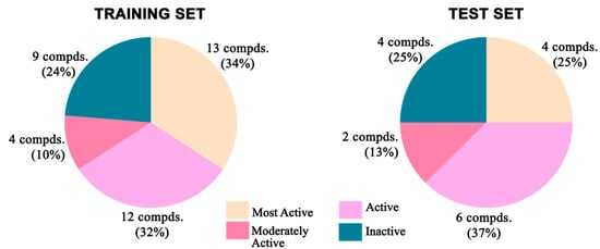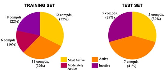 The 2D-QSAR model, employing a dataset of 54 molecules split in a 70:30% ratio, was primarily developed to establish a quantitative correlation between the 2D structural features and the corresponding experimental activities. It was computed with a multiple linear regression (MLR) approach involving various 2D descriptors available within the AlvaDesc v2.0.4 tool via an online chemical database v4.2.131 (https://ochem.eu, accessed on 7 February 2022) [42]. The model, which satisfied the external and internal validation criteria, was subsequently chosen, and a linear relation between the activity (expressed as the negative logarithm of IC50 or pIC50) and the values of the five descriptors of the chosen model was established, represented as the following equation. The corresponding standardized coefficient of the descriptors is provided in Figure S2 and represents their significance towards their activities.