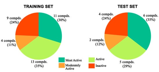 The training set and test set molecules were chosen randomly to reflect the variability in structure and activity throughout the whole dataset by considering that the test set molecules reflected a biological activity scale that was close to the biological activity of the training set. The whole group of compounds was split into a training set (37 compounds) and a test set (17 compounds) in a 70/30% ratio. Using the 37 aligned training set molecules, a 3D-QSAR model was established. The potential power of the developed 3D-QSAR model depended (Table S5) on the ability to evaluate the pIC50 values of the training set.