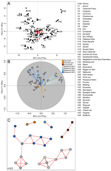 Unsupervised classification using PCA performed on the metabolomics profiles of 44 European grape varieties. Score plot (A) on samples (dark) and QC (red). Loading plot (B) with variables colored according to the polyphenol class and numbered according to metabolite names given in the Section 3. Spearman correlation-based networks of polyphenol metabolism (C), node numbers represent the metabolites and the color refers to the polyphenol class. Short edge distances indicate the Spearman coefficient importance and the correlation significance.