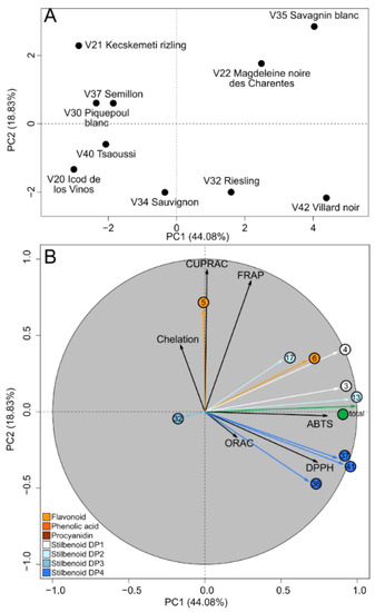 Unsupervised classification using PCA performed on polyphenol-enriched extracts for both antioxidant capacities and polyphenol contents. Score plot (A). Loading plot (B) with variables colored according to polyphenol class.