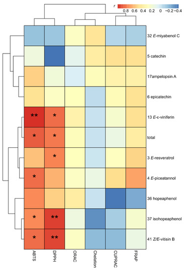 The heatmap clearly discriminated two clusters of polyphenols. The first group, including E-resveratrol (3), E-piceatannol (4), E-ε-viniferin (13), hopeaphenol (36), isohopeaphenol (37), Z/E-vitisin B (41) and total polyphenols, was positively and significantly correlated (r > 0.5; p < 0.05) with ABTS and DPPH capacities using two antioxidant tests based on mixed-mode (HAT/SET) antioxidant ability. The present results were consistent with a study on QSAR created for several stilbenoids, showing that the scavenging capacity of these compounds depends on both HAT and SET mechanisms [30]. Interestingly, in a study analyzing grape juices from 11 varieties produced in Brazil, the resveratrol content was also strongly correlated with DPPH and ABTS activities [34]. A second group, including, catechin (5), epicatechin (6), ampelopsin A (17) and E-miyabenol C (32), was weakly or not at all correlated with antioxidant capacities. We found that molecules driving the total antioxidant capacity in polyphenol mixtures, such as grape cane extracts, were not those with the highest antioxidant capacities such as a pure molecule [25]. Only a few studies investigated the variation of single compounds within a complex mixture in relation with antioxidant capacities, and combination studies usually included only several compounds [26]. However, several reports showed that grape antioxidants used as a polyphenol combination might potentiate chemoprevention efficacy [24,35,36].