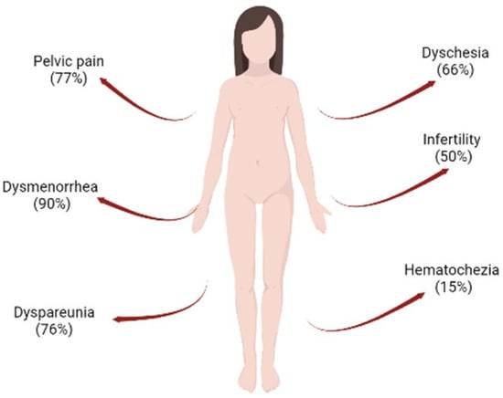 Currently, 190 million women worldwide present with endometriosis []. Endometriosis is a chronic, hormone-dependent inflammatory disease defined by the presence of foci of endometrial tissue outside the uterine cavity, which can be found mostly in the pelvic cavity, but can also be found in the ovaries, fallopian tubes, sigmoid colon, appendix, upper abdomen, among others []. In the general population, rates of the disease are difficult to quantify due to difficulties in a definitive diagnosis and asymptomatic cases, thus aggravating the condition of endometriosis. Therefore, estimates vary widely between different population samples and modes of diagnosis, all influenced by the presentation of symptoms and access to care []. Despite this limitation, the prevalence of endometriosis is greater than 10% in women in the reproductive period []. It is observed that 90% suffer from dysmenorrhea, 76% from dyspareunia, 77% from chronic pelvic pain, 66% from dyschesia, and 15% from hematochezia []. One of the most common complications in endometriosis is infertility, a symptom that occurs in 50% of women diagnosed with the disease (Figure 1). These symptoms compromise women’s quality of life, especially in relation to noncompliance with activities of daily living, personal relationships, and low productivity at work []. In addition, many studies report the correlation between anxiety and depression with pain symptoms and loss of fertility, leading to a rate of almost 87% of women with endometriosis developing some type of psychiatric disorder [].