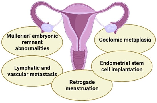 One of the first questions about the pathogenesis of endometriosis was the origin of glands and stroma such as the eutopic endometrium outside the uterine cavity, characteristics which constitute the disease. Several hypotheses have been proposed since 1870; however, none fully explain the pathogenesis of endometriosis []. Among the existing theories, the following stand out: the theory of coelomic metaplasia; the theory of Müller’s embryonic development; the theory of lymphatic and vascular metaplasia; the theory of implantation of endometrial stem cells; and the theory of retrograde menstruation (Figure 2) [,].