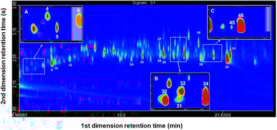 GC×GC-FID chromatogram (2D color plot) of an extract obtained by HS-MonoTrap™ of G. platensis virgin males. (A) Close up at retention time 5.2–7 min; (B) Close up at retention time 17.35–18.35 min; (C) Close up at retention time 20.1–21.6 min. Analytical conditions are described in Section 4.6. Peaks are numbered according to Table 1.