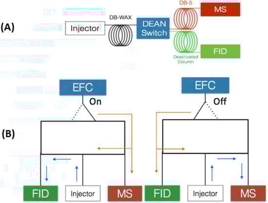 Column configuration for MD-GC system (A) and Dean switch schematics (B). Deans switch valve working diagram. EFC denotes for electronic flow control. Arrows denote the flow direction when EFC is switched “on”, flow directed to FID or “off”, flow directed to MS.