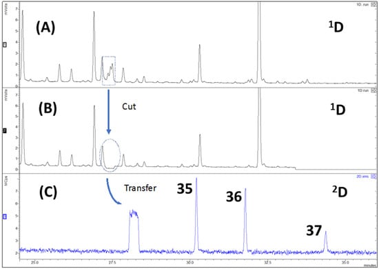 Example of chromatograms obtained by MD-GC of a HS-MonoTrap™ sample of E. globulus: (A) FID chromatogram; (B) FID heart-cut chromatogram; (C) TIC of the performed cut. Peaks are numbered according to Table 1. Analytical conditions are described in Section 4.5.