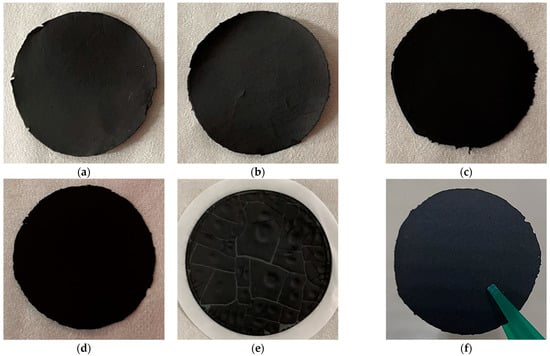 Pictures of (a) SWCNT BP, (b) 25% GO-SWCNT BP, (c) 50% GO-SWCNT BP, (d) 75% GO-SWCNT BP, and (e) 85% GO-SWCNT BP. All samples, except for 85% GO-SWCNT BP (which showed evident macroscopic cracks), were easy detachable from the porous PTFE filter and resulted in (f) self-sustainable and flexible disks.